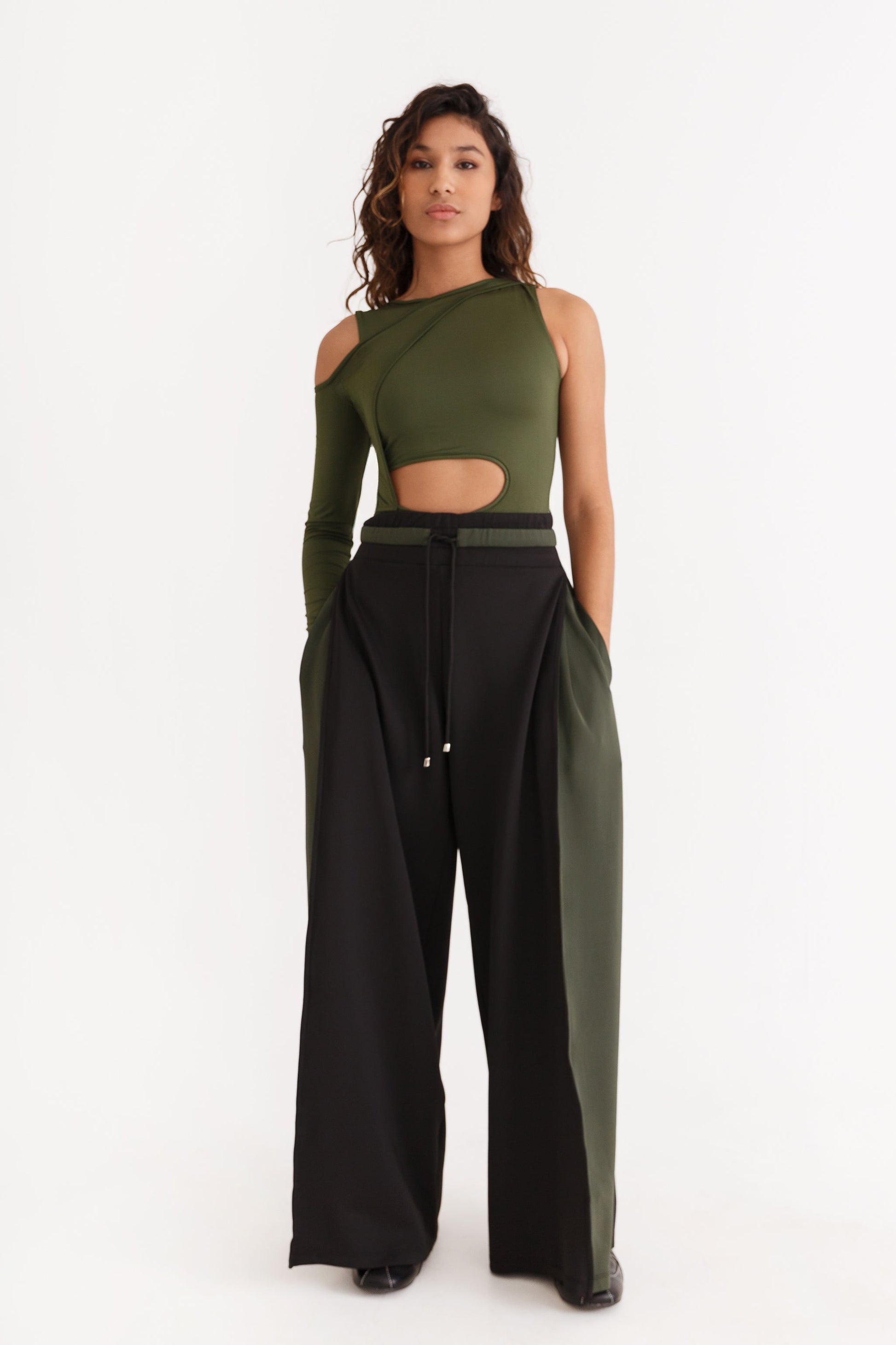 If comfort were a competition, these would win the gold medal. Made from luxe neoprene, these wide comfy pants feel like you're wearing a hug. Ideal for a long travel day, an epic movie marathon, or pretending you don't have to leave the house. A little side of color and a pocket for essentials make this the best thing for your legs. Available in black/olive green and black/chocolate.
