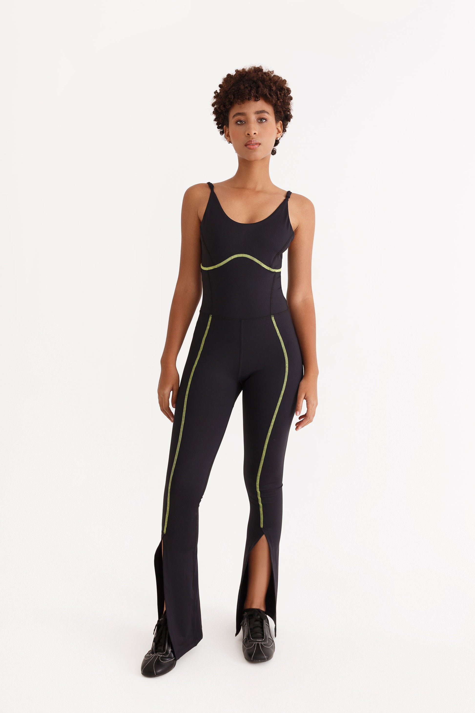 We call this "simple" because we didn't want to brag. It’s a perfectly sculpted bodysuit with a perfectly placed little cutout on top of the breasts—just enough edge without being too much. This piece is a true essential that's anything but basic. Perfect for layering or just being effortlessly cool. Comes in Brown with seams in black or Black with neon green seams.
